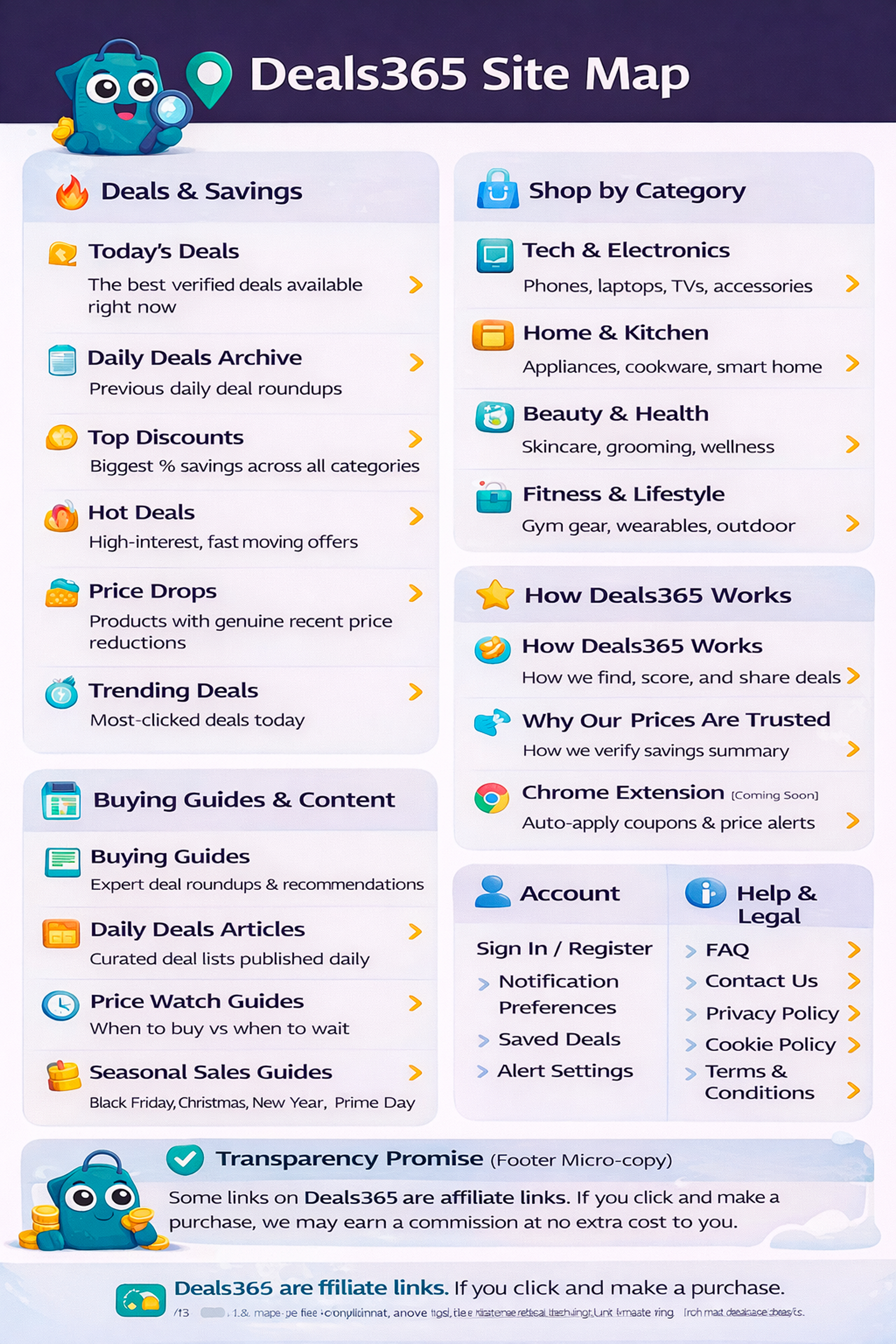 Explore the full Deals365 site map. Find deaily deals, verified discounts, buying guides, and transparent savings tools, all in one place.