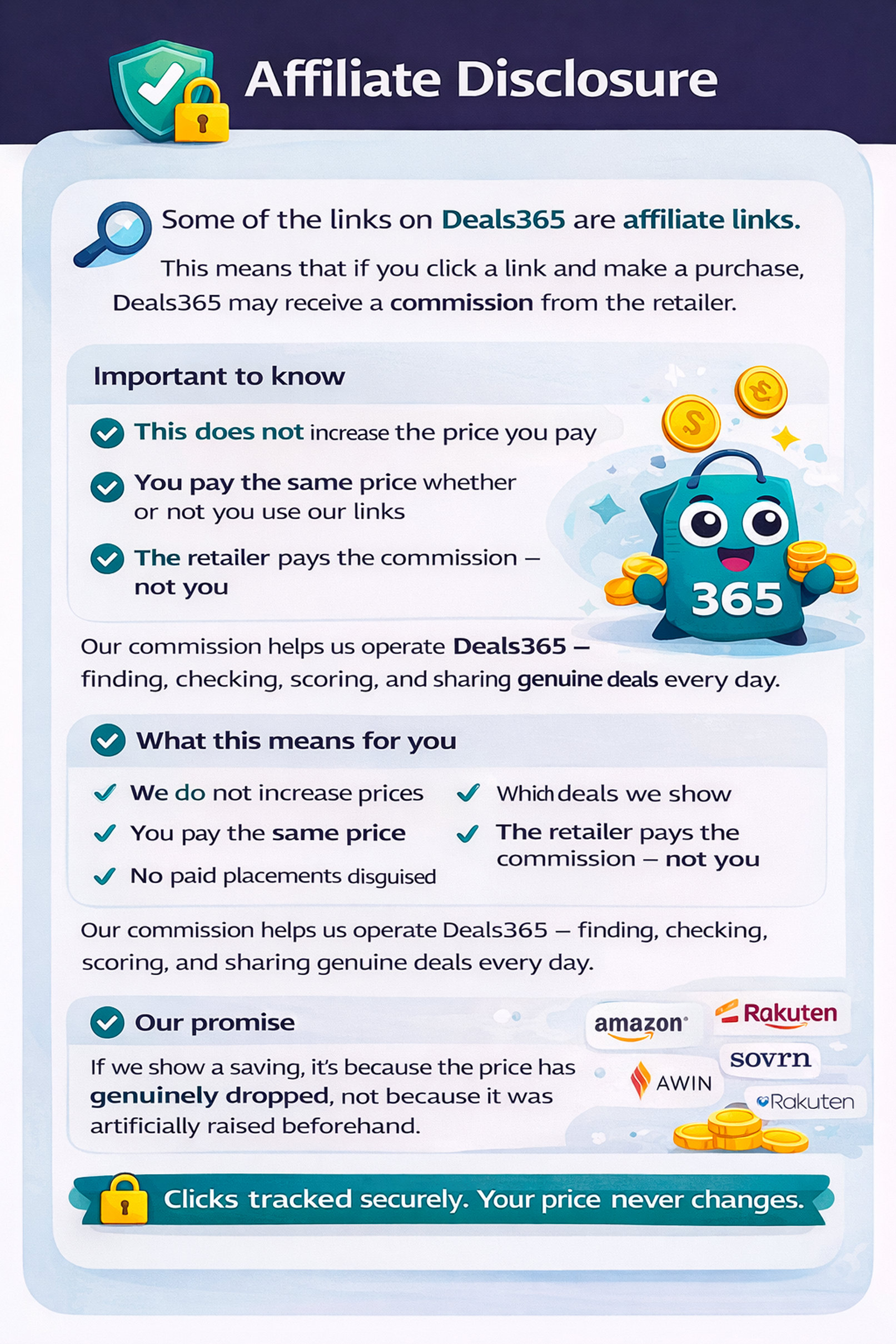 Deals365 only features deals from approved retailers and offiliate networks, including Amazon, Awin, Sovrn, Partneize and Rakuten.