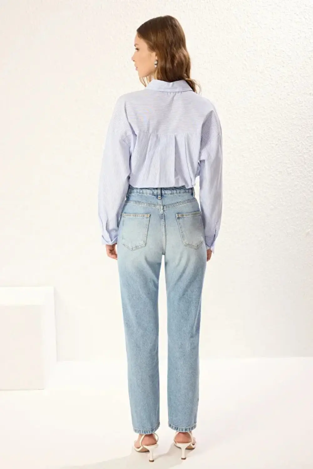 These high-waist straight-leg jeans are crafted from 100% cotton, ensuring breathable comfort and natural durability. The high-rise design shapes and supports your waist, while the straight-leg cut offers a classic, flattering fit suitable for various occasions. Combining timeless style with dependable fabric, these jeans are an expert choice for lasting wear and versatile wardrobe foundations. CARE INSTRUCTIONS: Check the care label for instructions. • Pre-treat stains before washing. • Machine wash on a gentle cycle with cold water. • Use a mild detergent suitable for delicate fabrics. • Avoid bleach and fabric softeners. • Air dry or use a low heat setting in the dryer. • Iron on a low-temperature setting if needed. • Store in a cool, dry place away from sunlight. COLOR DISCLAIMER: Your screen brightness, contrast, and saturation settings will affect the image viewed on your screen.